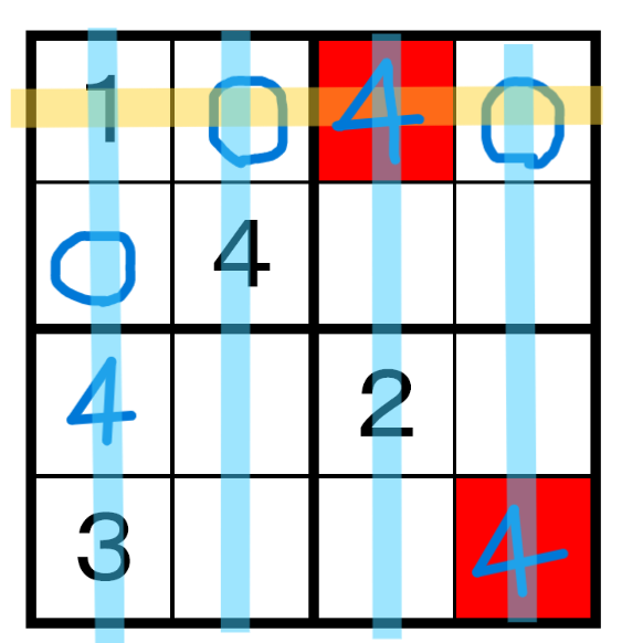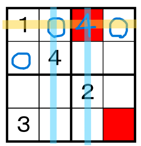 縦の列、左から2、3列目は4が埋まったので残りの縦2列に4を埋めようとすると、