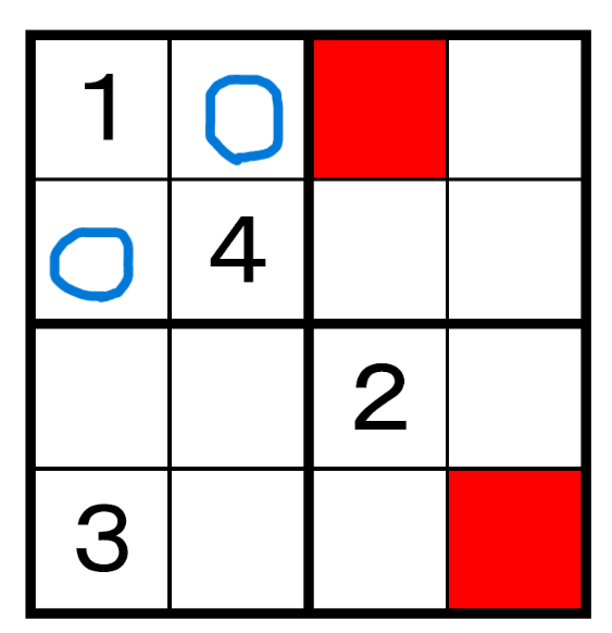 いきなり赤のマスは思いつかないので、左上の4マスの残り2マスに2、3をうめます。